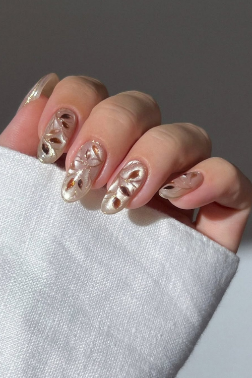 This season, it’s all about glam meets tradition. Think chrome golds, deep maroons, shimmer tips, and festive French manicures